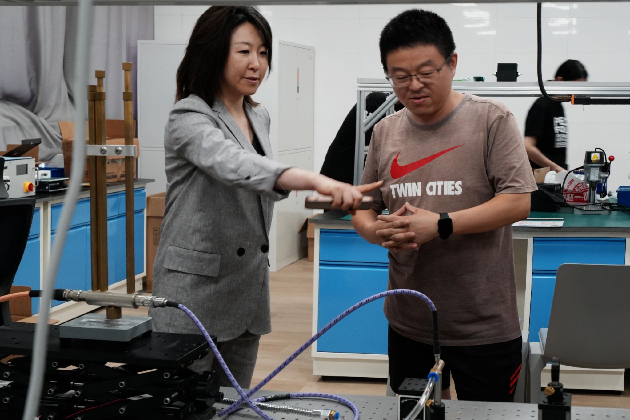 张建功副主任向调研团成员介绍参观了国家大学科技园展厅、多个前沿创新平台及实验室。他详细阐述了我校与盐城高新区的合作模式,并简要介绍了科技园在创新创业环境营造、科研成果转化及企业孵化服务等方面所开展的工作。参观过程中,胡楠多次驻足观看,并与科研人员进行了深入交流。