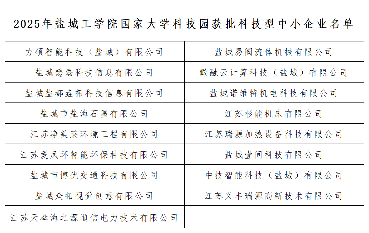 日前,江苏省科技厅公示了2025年入库科技型中小企业名单。据统计,2025全年,盐城工学院国家大学科技园共获批17家。以下为公示名单。