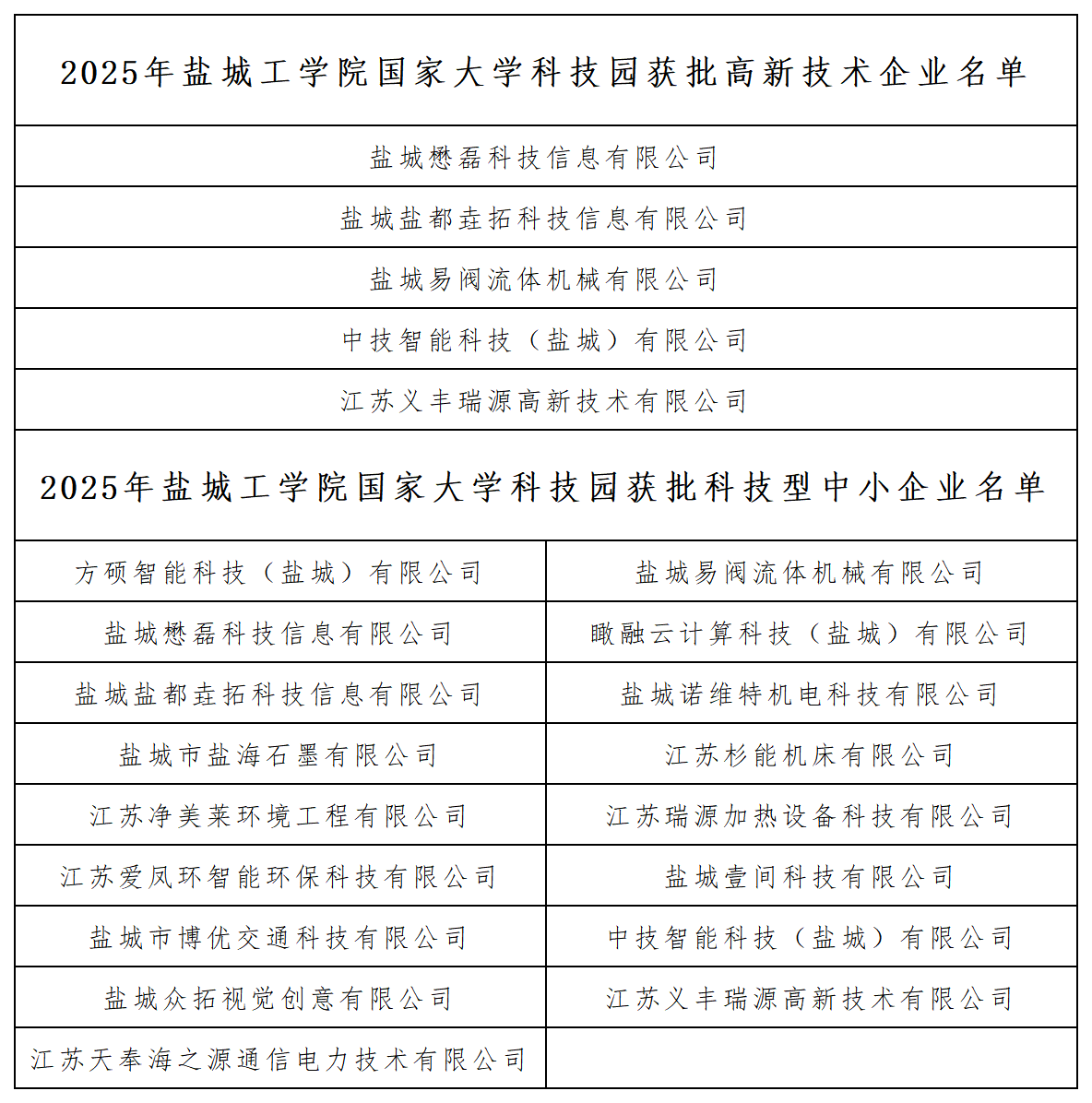 近期,全国高新技术企业认定管理工作领导小组办公室发布《对江苏省认定机构2025年认定报备的第一批高新技术企业进行备案的公示》、《对江苏省认定机构2025年认定报备的第二批高新技术企业进行备案的公示》,我校国家大学科技园在孵的 “盐城盐都垚拓科技信息有限公司” 、“中技智能科技(盐城)有限公司”等5家企业获批国家高新技术企业,17家企业获批江苏省科技型中小企业。截至目前,科技园已累计孵化企业256家,自主培育高新技术企业13家,科技型中小企业96家,在推动产学研深度融合、创新主体培育方面取得了显著成效。