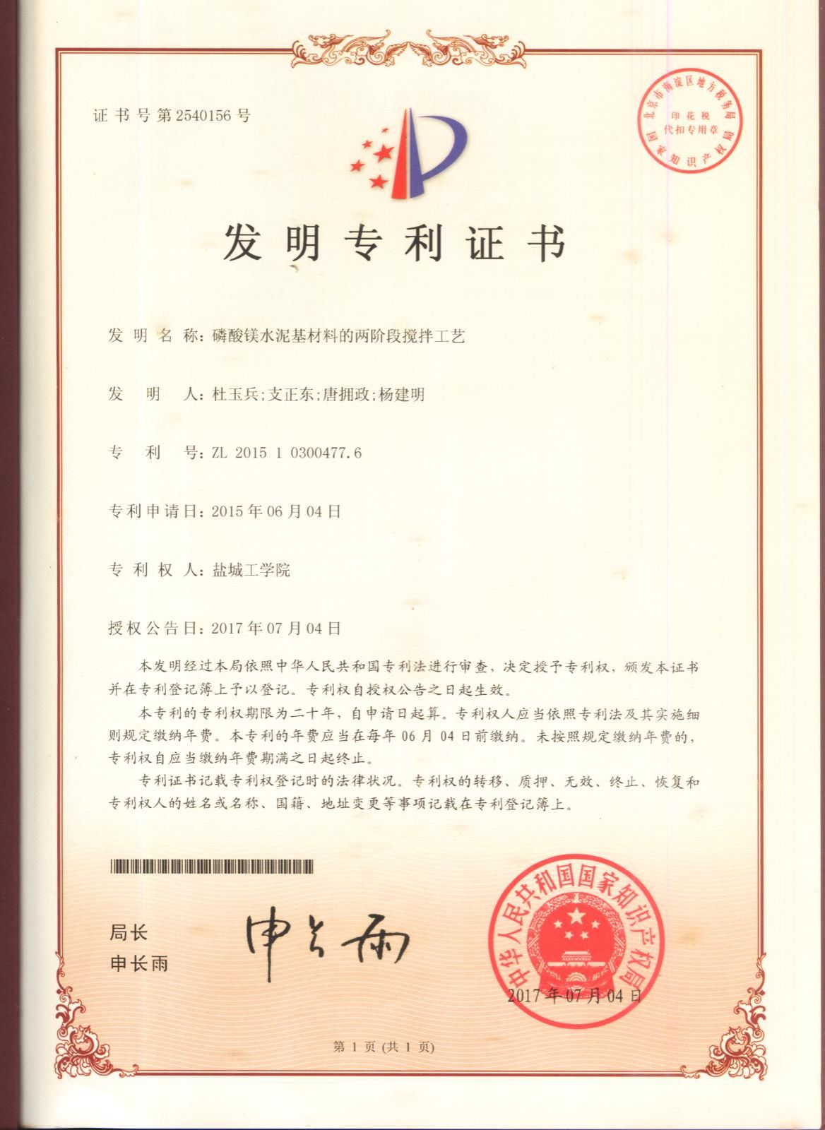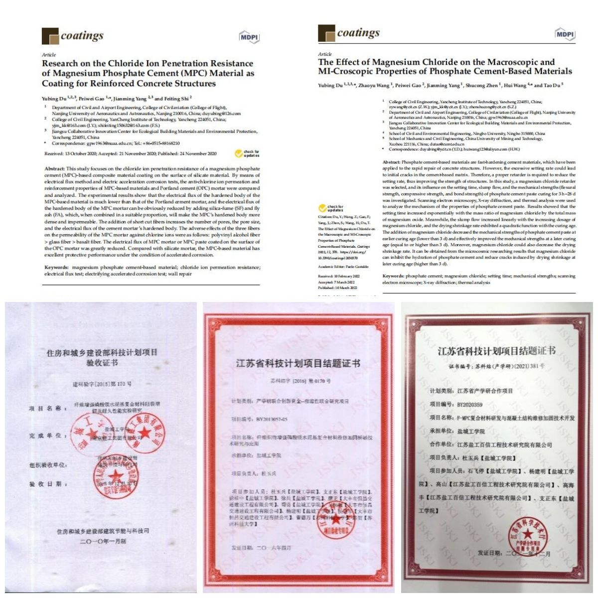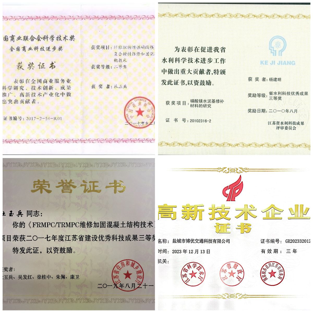 (2)荣获中国商业联合会“纤维织物增强磷酸镁水泥基复合材料维修加固混凝土结构技术”科技进步二等奖、江苏省水利厅“磷酸镁水泥基修补材料的研究”技术创新三等奖、省住房和城乡建设厅“FRMPC/TRMPC维修加固混凝土结构技术”三等奖等6项省部级奖项,技术成果入选住建部重点推广目录。