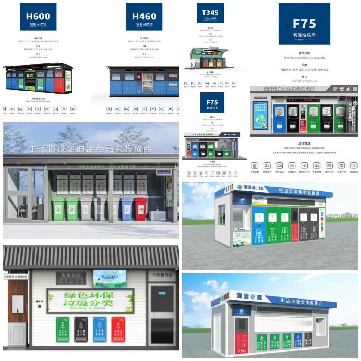 (1)智能设备:F75垃圾房(全拼装结构、五重消杀系统)、T345分类亭(智能投口+防夹手设计)等适配多场景。